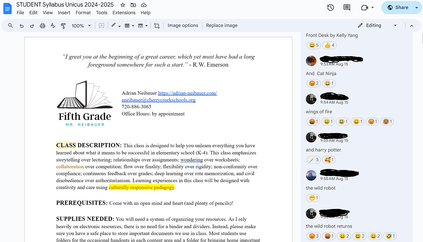 I first learned about an annotated syllabus from Dr. Remi Kalir, Associate Director, Faculty Development and Applied Research, Duke Learning Innovation & Lifetime Education. Having a syllabus is not really a K-5 thing, but I was curious how I might use it to encourage more annotation and marginalia with my students. I created my Syllabus Unicus after reading Dr. Kalir’s book, Annotation, and shared it with both students and parents. This is the first year I’ve used a syllabus to communicate how I run my classroom. I will be the first to admit that I went a bit overboard. Students latched onto the Recommended Reading section and ignored the rest. I will shorten it next year, removing the Resources That Inspire My Pedagogy section and only having students annotate specific areas that are most relevant to teaching and learning.
