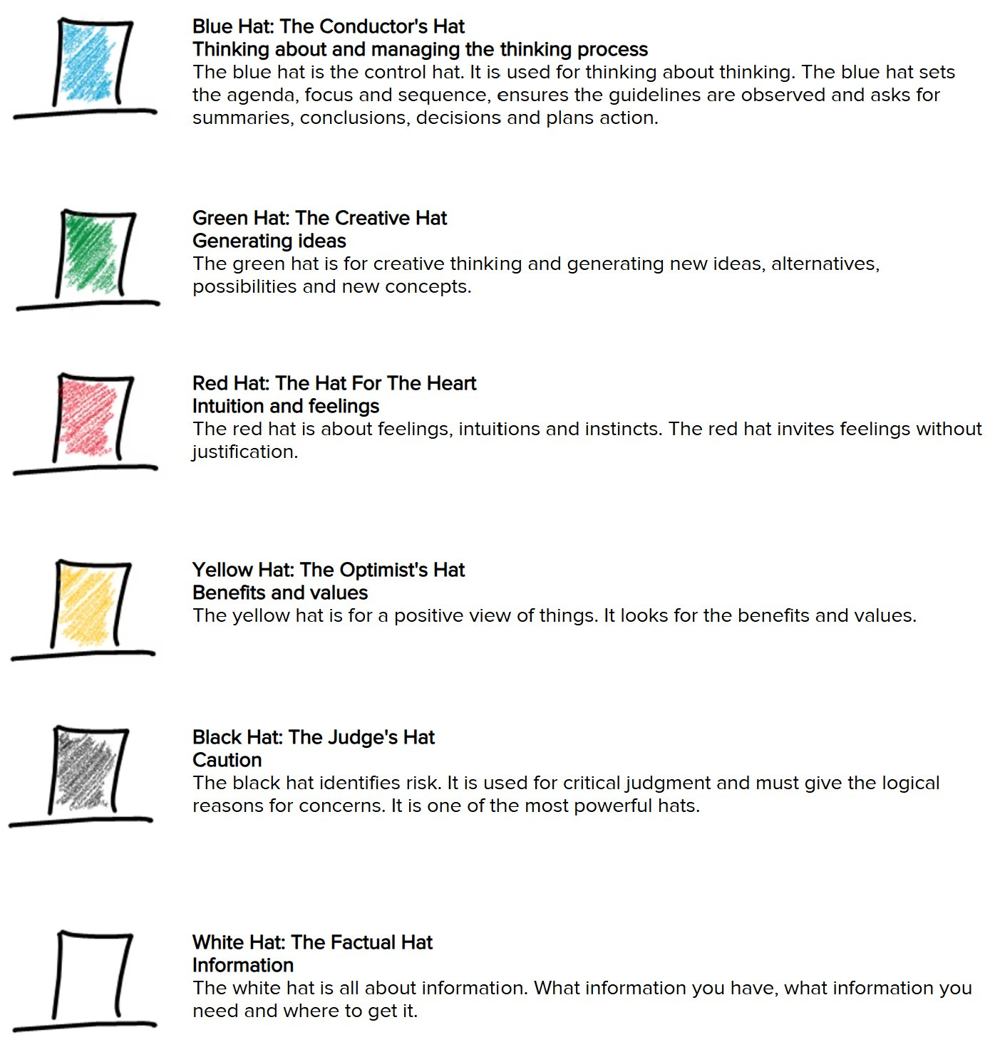 The process has team members separating their thinking into six clear functions and roles. Each thinking role is identified with a colored symbolic “thinking hat” — Blue, Green, Red, Yellow, Black, and White. By figuratively wearing and switching “hats,” you can better focus or redirect your thoughts during a group’s conversation.