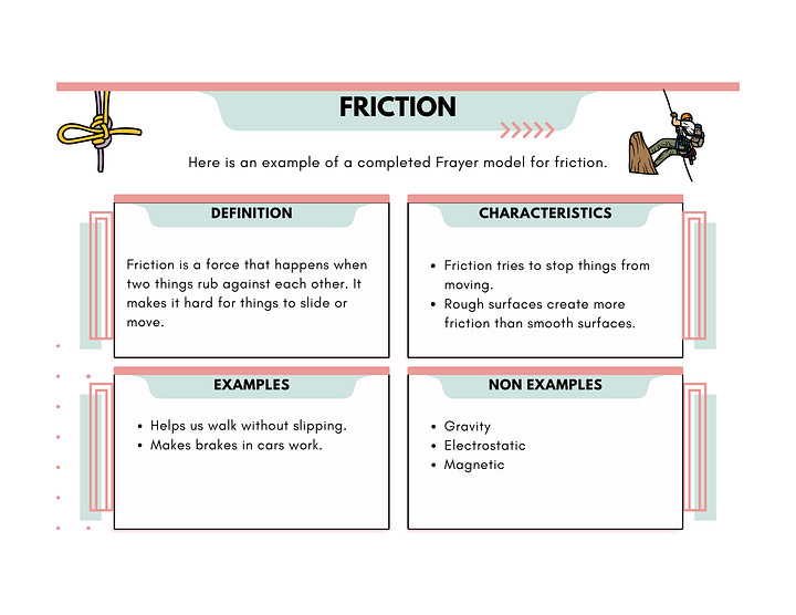 The Frayer Model is a graphic organizer that I use for teaching big concepts. It was developed by Dorothy Frayer, Wayne Fredrick, and Herbert Klausmeier in 1969 to help students build their vocabulary, enabling them to determine or clarify the meaning of unfamiliar words. This technique requires students to define a word or concept and apply their knowledge by generating examples and non-examples, giving characteristics, and/or drawing a picture to illustrate the meaning of a word.