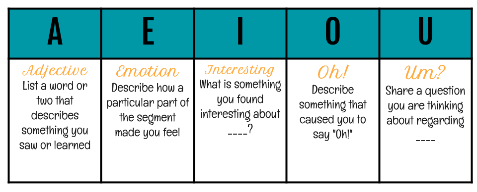 I often use this protocol as an exit ticket after students watch a video as a class or read a text individually. It is a quick way to check for understanding and a great starting point for a classroom discussion afterwards. Before we watch a video, or students read a text, I pass out an index card (5” x 7” give students plenty of room to write). Students know they must have something written down for each vowel. Before I collect the cards, I have students share anything they wrote down for any letter. Students love sharing what they found interesting or what caused them to say, Oh! If multiple students have similar questions about the video or text, I can address in those quickly. I also want students to have practice describing how a particular video or passage makes them feel. Students do not get many opportunities to connect their emotions to what they are learning, and I find this A-E-I-O-U protocol is a great tool for that.