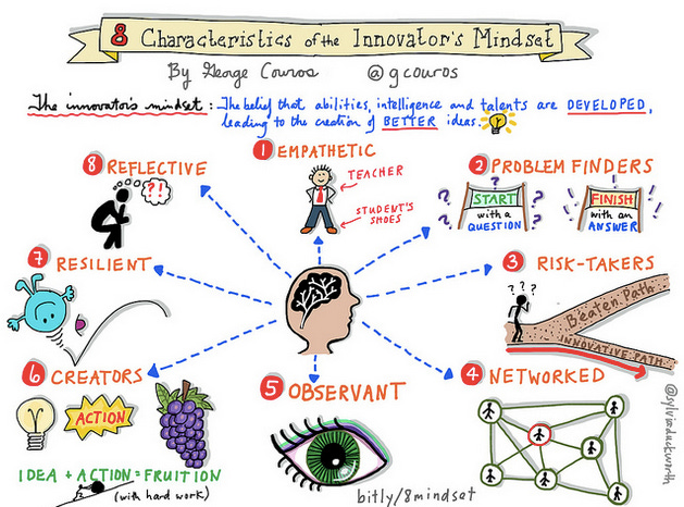 George Couros used Carol Dweck’s Growth Mindset to create his Innovator’s Mindset. He describes the importance of eight characteristics for students to have when being innovative: (a) empathetic; (b) problem finders; (c) risk-takers; (d) networked; (e) observant; (f) creators; (g) resilient; (h) reflective. Notice that being a problem finder is an important characteristic of creativity and innovation.