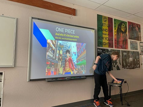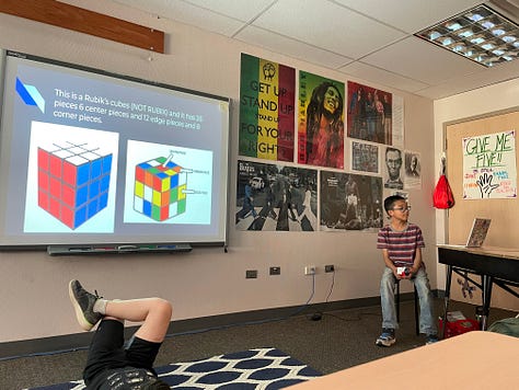 The first year we did this, we learned how to solve a Rubik’s Cube, fold origami, and how and why cats purr. I put out an all-school call to anyone willing to donate Rubik’s Cubes for a day and spent an afternoon cutting 8.5 x 11-inch copy paper into square origami paper. One student shared his love of Japanese culture. Another presented an incredible Ignite session titled: 20 Things Shrek Taught Me About Life. Students improved their speaking and presenting skills and learned a ton of great things from each other. It was a fantastic experience!