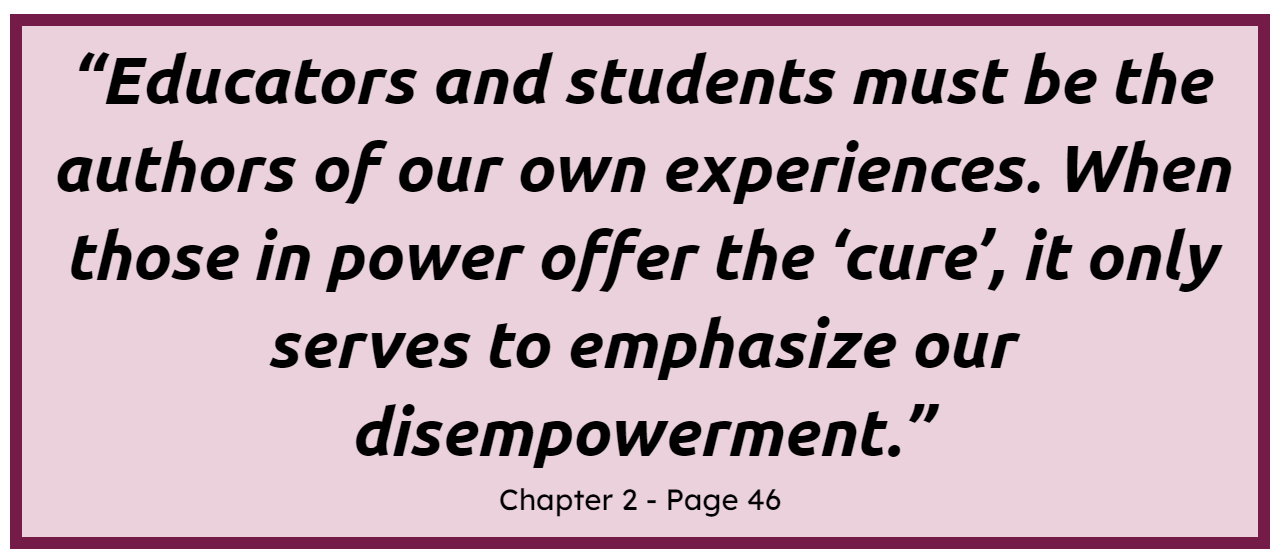 These last few years have felt like survival mode. As Venet says “learning is challenging when we are in survival mode” (p. 51). It’s impossible to feel empowered when teachers feel like our agency is taken away. Since 2020, I’ve been expected to implement numerous standardized curricula (including a new social-emotional curriculum like Oriana), seen a redoubled effort to raise standardized test scores, and struggled to engage my students, while trying to heal their past trauma wounds.