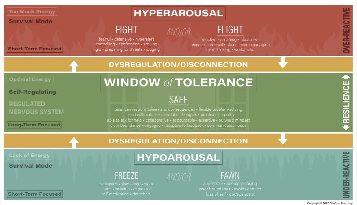Dan Siegel, a Clinical Professor of Psychiatry, calls this the Window of Tolerance. It is used to describes the optimal state of stimulation in which we are able to function in everyday life. When we exist within this window, we are able to learn effectively, play, and relate well to ourselves and others.3 On either side of the window, one can enter hyperarousal or hypoarousal. Hyperarousal is characterized by anxiety, panic, or anger. Your body is in fight-or-flight mode, with symptoms like rapid heartbeat, quick breathing, and muscle tension. It’s a survival response to perceived threats. Hypoarousal involves low energy, numbness, and disconnection. Your body is in a state of conservation, often described as a shutdown in response to overwhelming stress or trauma. Unfortunately, I’ve seen more and more students come to my classroom emotionally dysregulated and unable to learn because of previous trauma.
