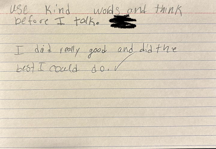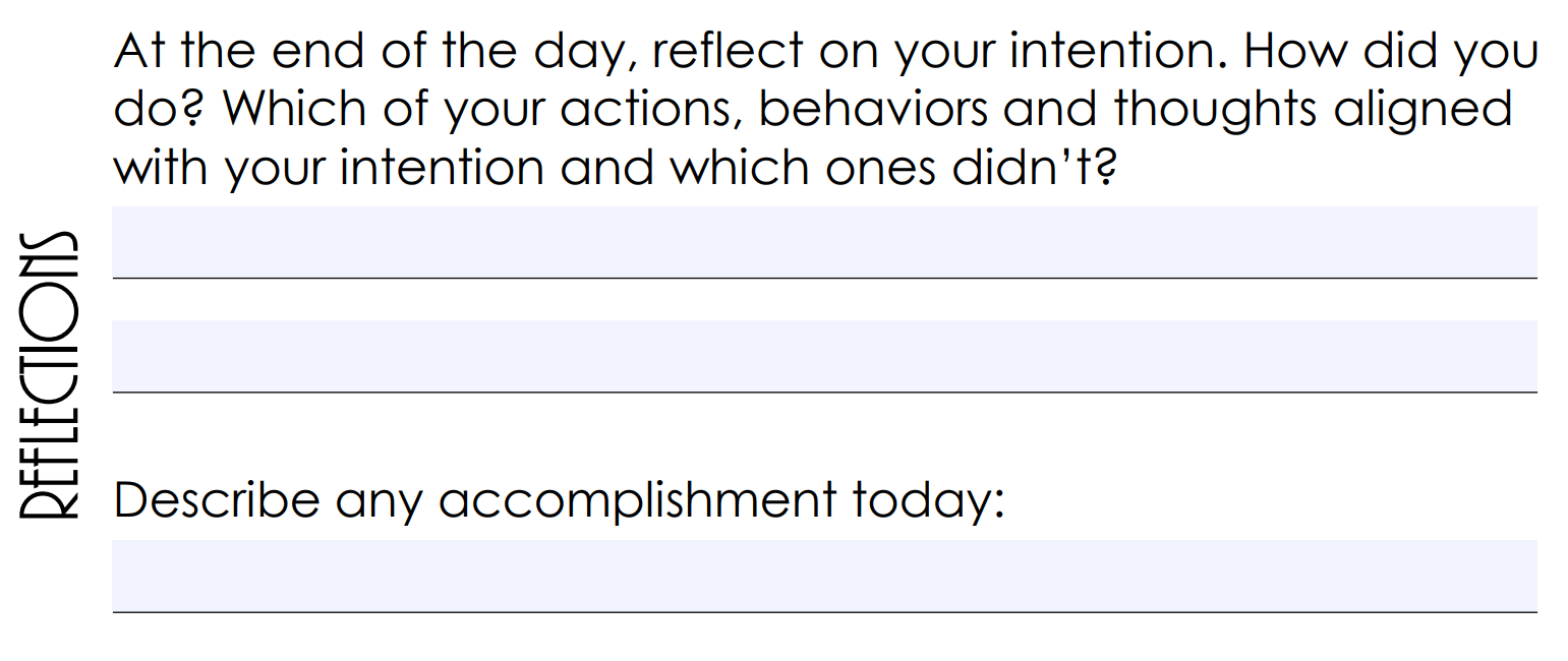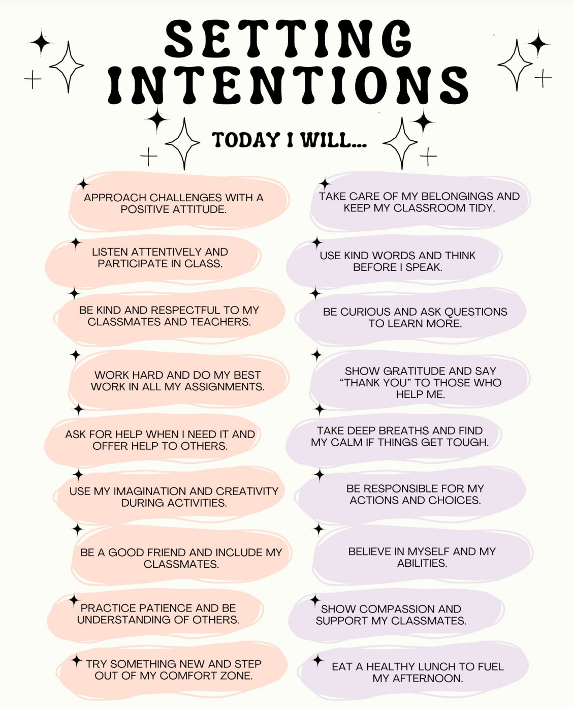 At the end of the day, I have students reflect on their day and their intention. How did they do? Which of their actions, behaviors and thoughts aligned with their intention? Which ones didn’t? What accomplishments did they have today?
