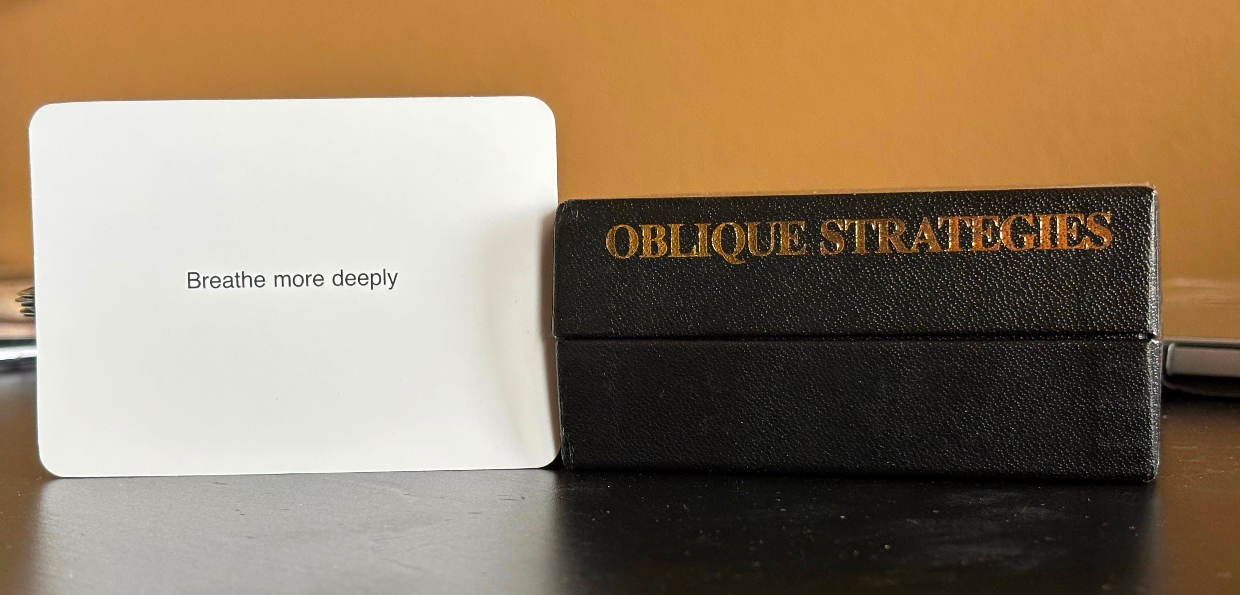 On Thursday, I got a little desperate and thought I should revisit an older piece I wrote. I read it again and remembered why I shelved it in the first place. On Friday, I started sweating a bit. Nothing was coming and I was beginning to run out of Spring Break. I pulled out my stack of Oblique Strategies by Brian Eno and Peter Schmidt. Perhaps the universe (with Eno and Schmidt) could advise me on what to write?