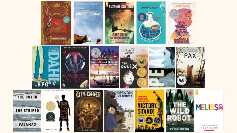 Here is a great list of potential book club books for upper elementary/middle-grade students (ages 10-12).